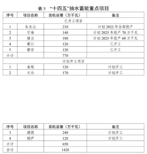 有序發(fā)展抽水蓄能電站。積極推進(jìn)長龍山、寧海、縉云、衢江、磐安等抽水蓄能開工項目的建設(shè),穩(wěn)妥開展泰順、天臺等抽水蓄能電站項目前期工作,適時啟動建德、桐廬站點的前期工作。結(jié)合現(xiàn)有站點,合理規(guī)劃布局,積極推動新一輪抽水蓄能電站選點工作。加強(qiáng)抽水蓄能電站建設(shè)管理體制、電價機(jī)制等研究。"十四五"期間,全省抽水蓄能電站力爭新增裝機(jī)容量 340 萬千瓦,累計裝機(jī)容量達(dá)到798 萬千瓦。