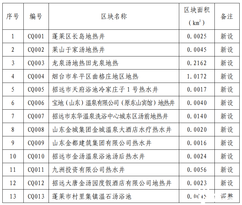 規(guī)劃期內(nèi),共設(shè)置地?zé)峥辈?/a>區(qū)塊2處,分別為山東省棲霞市惠禾·艾山地區(qū)地?zé)崞詹楹?a href="http://www.pingtaibi.cn/t/山東.html" >山東省棲霞市長(zhǎng)春湖·霞光地區(qū)地?zé)崞詹?,投放時(shí)間為2022年。規(guī)劃地?zé)嶂攸c(diǎn)開采區(qū)1處,位于招遠(yuǎn)市東湯地?zé)崽?/a>。重點(diǎn)開采區(qū)內(nèi)要嚴(yán)格按照開采規(guī)劃區(qū)塊優(yōu)先投放采礦權(quán),鼓勵(lì)支持礦山企業(yè)整合重組,優(yōu)化開發(fā)布局,提高資源利用效率。