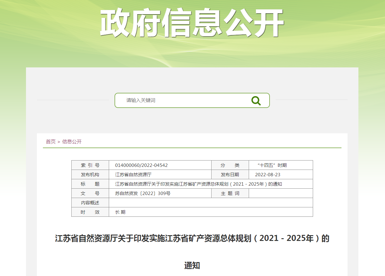 地大熱能地熱能開發利用:《江蘇省礦產資源總體規劃(2021-2025年)》(以下簡稱《規劃》)業經自然資源部批準,并經江蘇省政府同意,近日印發。