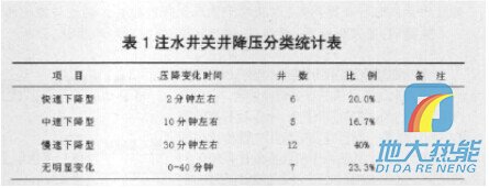 為確定合理降壓時(shí)間,在我隊(duì)30口注水井洗井過(guò)程中觀察注水井壓力隨關(guān)井時(shí)間的變化,以短時(shí)間(60分鐘)壓力出現(xiàn)直線段或相對(duì)直線段統(tǒng)計(jì),歸納總結(jié)如表1所示的幾種類型:快速下降型、中速下降型、慢速下降型、無(wú)明顯變化型。 根據(jù)調(diào)查統(tǒng)計(jì)結(jié)果,來(lái)確定不同類型的關(guān)井降壓時(shí)間:快速下降型的井只需關(guān)井3 ̄5分鐘;中速下降型的注水井需關(guān)井10 ̄15分鐘;慢速下降型的注水井需關(guān)井降壓30分鐘,無(wú)明顯變化型的注水井可直接洗井(洗井時(shí)應(yīng)觀察壓降的變化)。為此關(guān)井降壓的最佳時(shí)間應(yīng)該是壓降變化趨于穩(wěn)定的時(shí)間,較為合理。