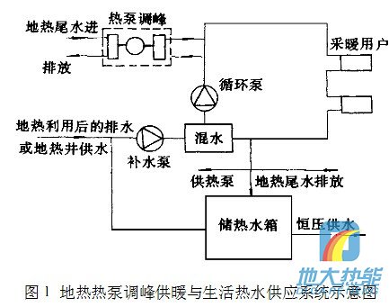 以往計(jì)算分析說明[:地?zé)?a href="http://www.pingtaibi.cn/t/熱泵供暖.html" >熱泵供暖系統(tǒng),以地?zé)峒?a href="http://www.pingtaibi.cn/t/熱泵.html" >熱泵調(diào)峰供暖方式的供暖成本和投 圖1地?zé)?a href="http://www.pingtaibi.cn/t/熱泵.html" >熱泵調(diào)峰供暖與生活熱水供應(yīng)系統(tǒng)示意圖資低于熱泵單獨(dú)作熱源的供暖方式。