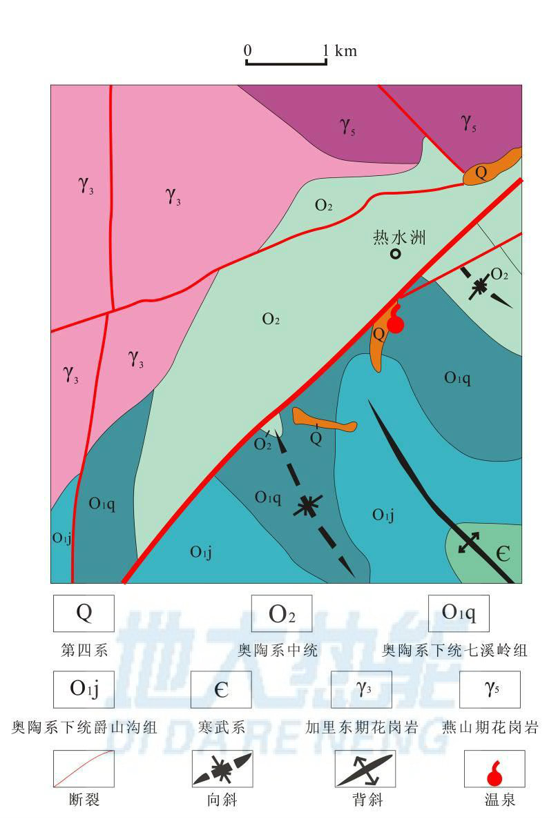 溫泉區(qū)呈橢圓形展布,長(zhǎng)軸長(zhǎng)度約550m,短軸最長(zhǎng)處約120m,主泉水溫60℃以上,出水量大于2000噸/日。